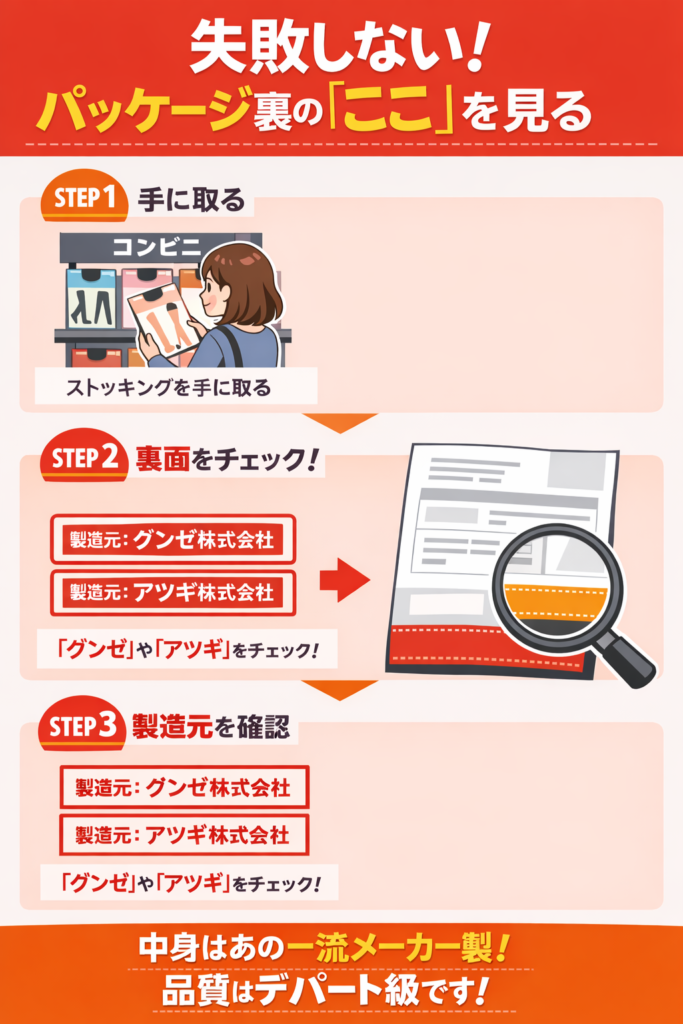 多くの場合、小さな文字で「製造元:グンゼ株式会社」や「アツギ株式会社」と書かれているはずです。これはつまり、ドラッグストアやデパートで売られている「SABRINA」や「ASTIGU」といった有名ブランド商品と、同等の技術や品質で作られているという動かぬ証拠です。