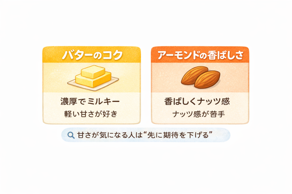 ここで起きる失敗は、バターのコクを期待していたのに、香ばしさが勝って「軽いと思った」「思ったより甘さが立った」と感じることです。香ばしさは“味が濃い”と同義ではないので、方向が違うだけで評価が割れます。