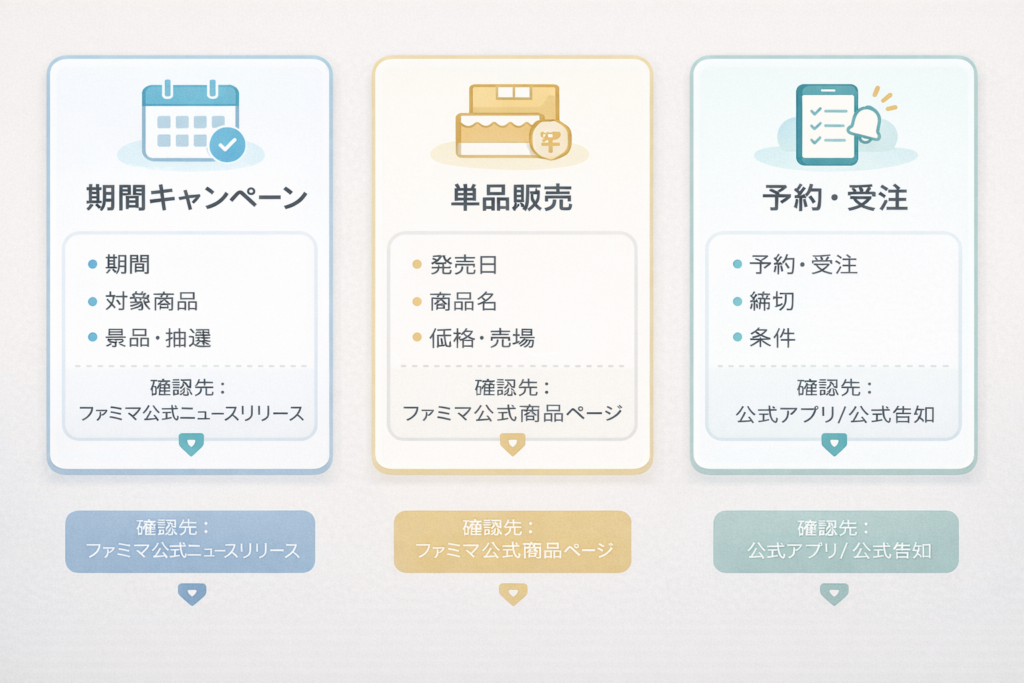 | 単品販売 | 「新発売」「発売日」「商品名」「価格」 | 中 | 店頭(棚で買う) | ファミマ公式の商品ページ | 取り扱い無し/地域差/売場ミス |