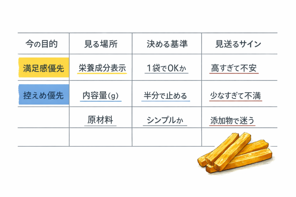 ここでよくある失敗は、「健康そうだから干し芋」と決め打ちしてしまい、その日の状況とズレることです。たとえば、空腹が強いのに干し芋を選ぶと、満足感が足りずに結局追加で買い足してしまう。そうなると、最初に干し芋を選んだ意味が薄れます。数値で判断するというのは、栄養の計算をすることではなく、「今日は満足感優先か、控えめ優先か」という目的を先に決めて、表の中で合う選択肢を選ぶことです。