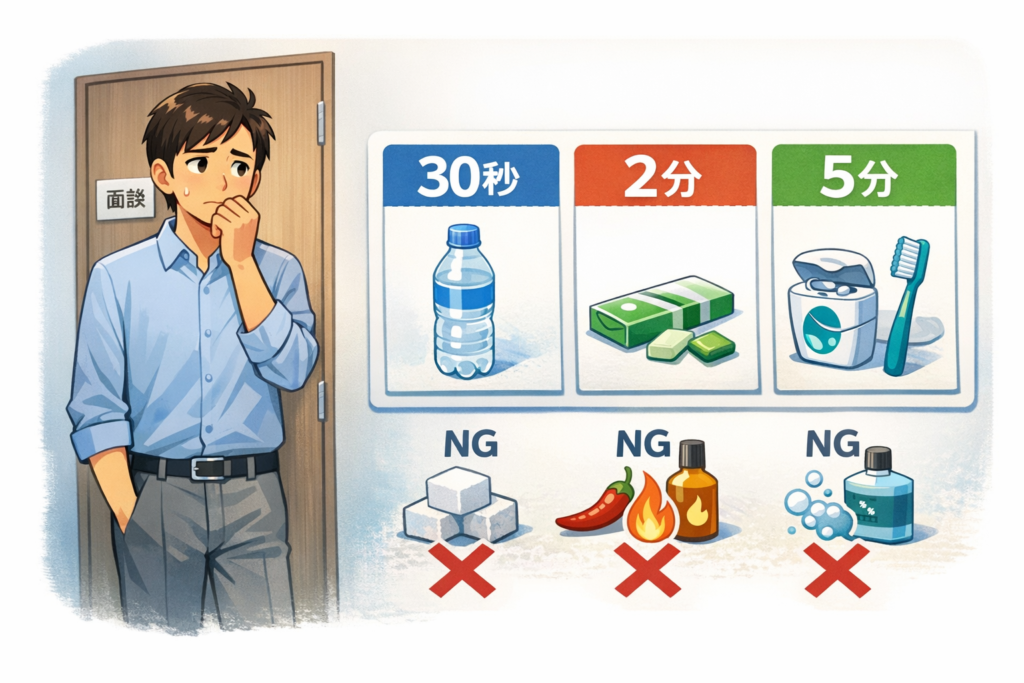 面談室の前。あと数分でドアが開いて、至近距離で自己紹介が始まる。口の中がカラついてきて、息が気になるのに、トイレへ戻る余裕もない。こういう「直前の口臭」は、香りで押し切るよりも、まず口の乾きを落として唾液を動かし、次に残りやすい場所を減らし、抗菌は補助として使うほうが安全で確実です。焦って糖や強い刺激に寄ると、会話中に“戻った気がする”不安が出やすくなります。