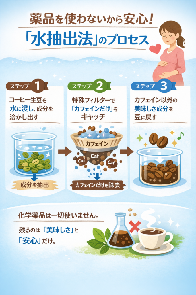 これは、水の中にコーヒーの生豆を浸し、カフェインだけをフィルターで取り除く方法です。この化学薬品を使わない水抽出法(原因)によって、残留溶剤のリスクをゼロに抑えながら、97%以上という高いカフェイン除去率(結果)を実現しているのです。