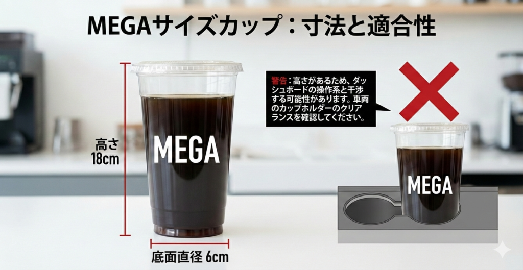 メガサイズの底面はMサイズとほぼ同じ約6cmに設計されているため、標準的な車のドリンクホルダーには問題なく収まります。