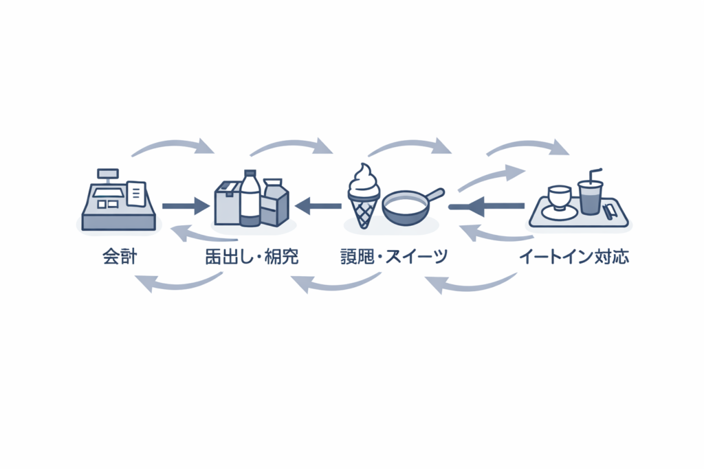 店内の動き 売り場中心 厨房やイートインも意識しやすい 忙しさが「移動」と「並行作業」で出やすい