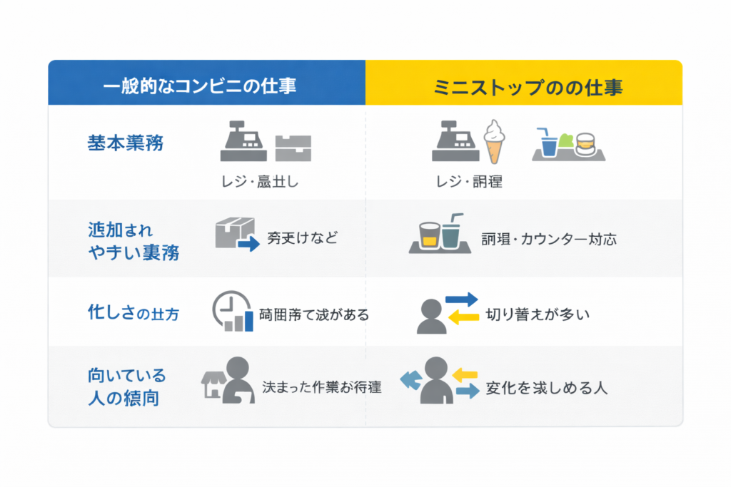 ミニストップは、レジや品出しだけで回る店ではありません。店内調理やソフトクリーム、ホットスナック、イートイン対応まで含むため、仕事の難しさというより、仕事の種類が広がりやすい店です。ミニストップ公式でも、コンビニとファストフードを組み合わせた業態として案内されています(ミニストップ公式)。