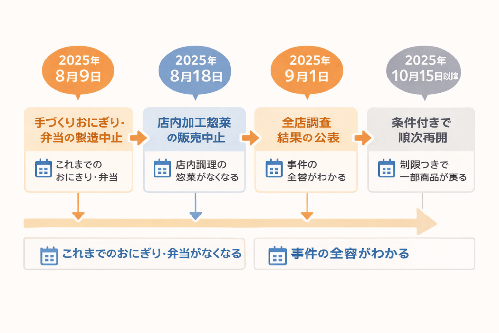 8月9日 手づくりおにぎり・弁当の製造中止 初動で主力の店内調理品を止めたか