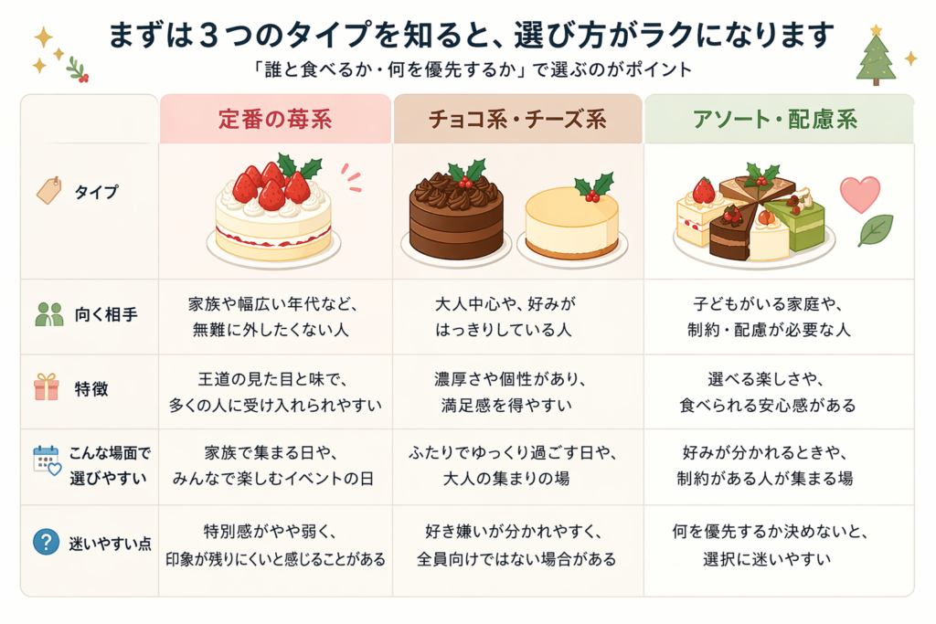 | 定番の苺系 | 家族・無難に外したくない人 | 王道で選びやすい | みんなが食べる日 | 特別感が足りないと感じることがある |