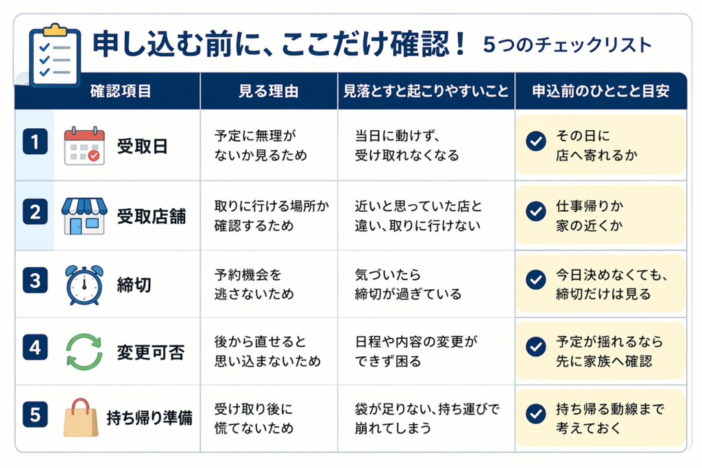 確認を最後に回すと、決めたあとの不安が残ります。反対に、この表の項目だけ見てから申し込むと、「もう一回考え直さないと」という戻りが減ります。実際に困りやすいのは、味の後悔より、受取日や店舗の勘違いです。別の具体シーンとして、子どもの予定や仕事の都合が直前まで動く週でも、変更可否と受け取り動線を先に見ておけば慌てにくくなります。今の段階で必要なのは、全部を調べ直すことではなく、申し込める条件がそろっているかだけ確認することです。