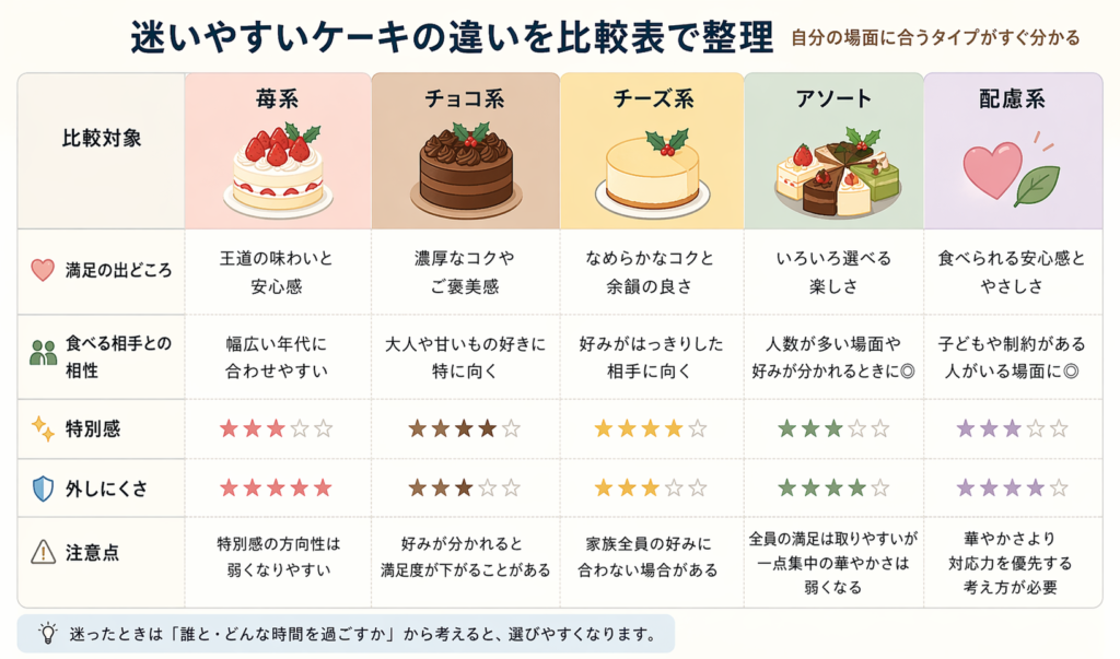 苺系、チョコ系、チーズ系、アソート、配慮系は、値段より“満足の出どころ”が違います。違いを先に見ておくと、何となくで選ぶ失敗を減らせます。