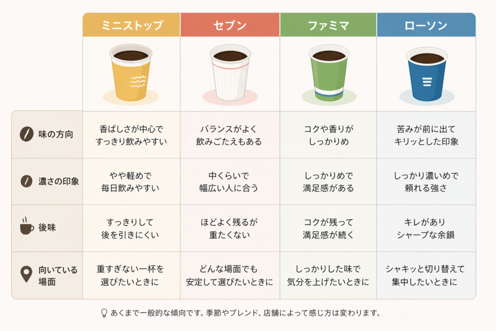 他社と並べると、ミニストップのコーヒーは何で選ばれやすいかが見えてきます。優劣を決めるというより、自分の好みと場面に合う位置を探す感覚で見たほうが実用的です。