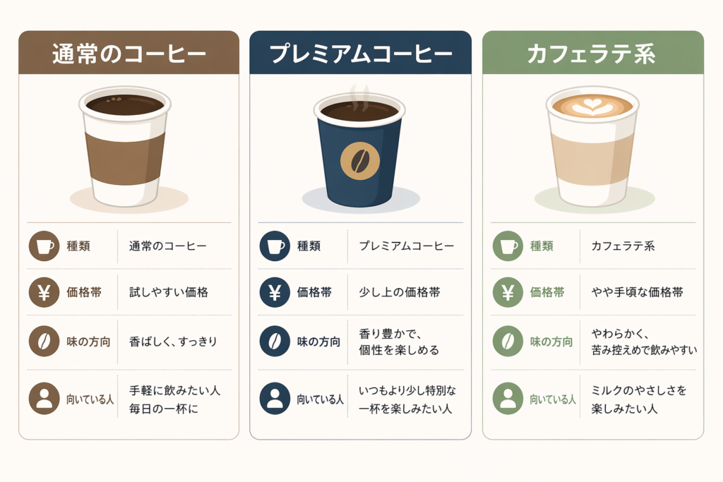 | プレミアムコーヒー | 少し上 | 個性や香りを楽しみやすい | せっかくなら違いを感じたい人 |