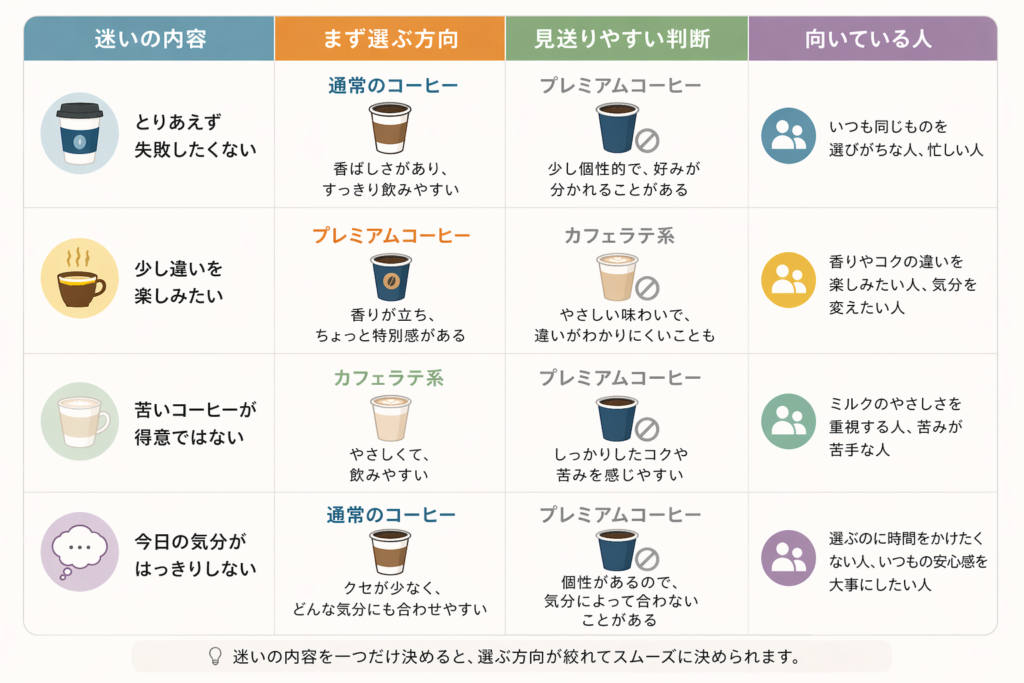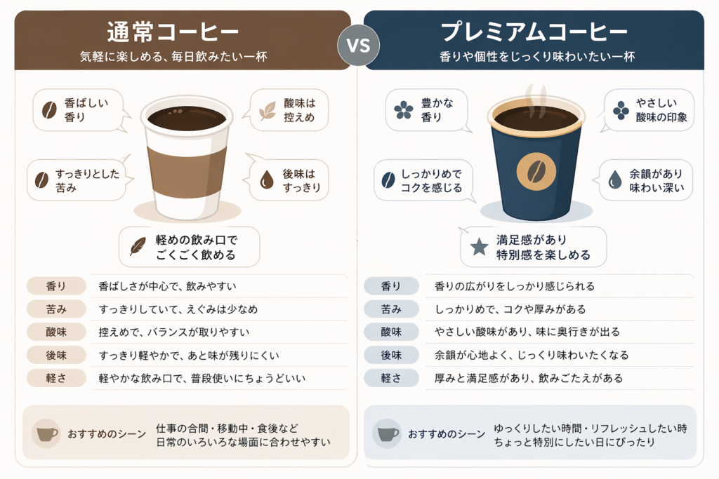 | 少し違いを楽しみたい | プレミアムコーヒー | 価格差に意味を感じにくい日は通常でも十分 | 香りや個性を試したい人 |