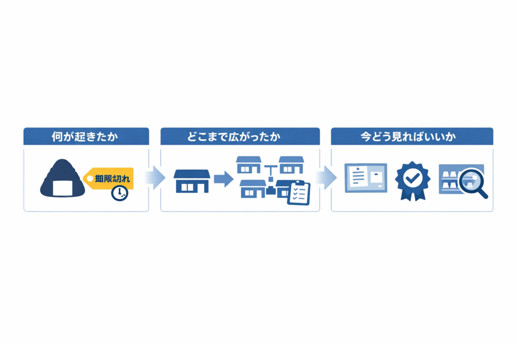 昼に買ったおにぎりを食べ終えたあとでニュースを知った人は、「もう食べたから手遅れかもしれない」と考えがちです。ただ、最初にやるべきことは不安を広げることではなく、問題の種類を正確に理解することです。朝の買い物後だけでなく、通勤中にSNSで見かけて不安になった人でも、最初の着地点は同じです。まずは印字の見間違いではなく、期限管理そのものの不正だったと押さえてから先へ進むと、判断がぶれにくくなります。