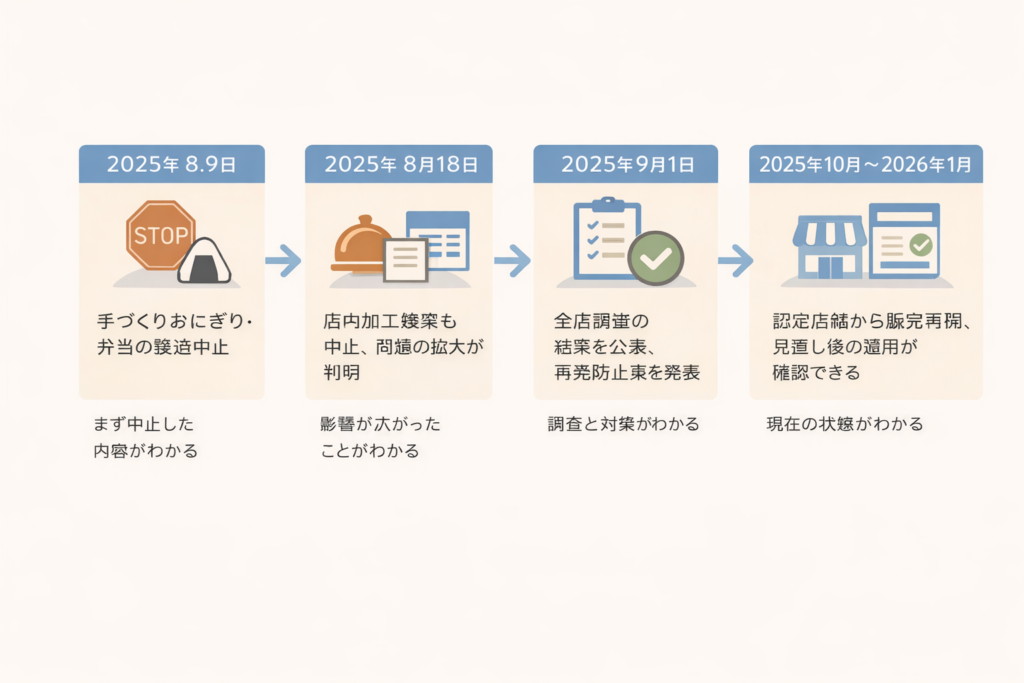 夕方にレジ前で迷って検索した人と、家でニュースを見た人では、必要な情報が少し違います。レジ前なら「今の売場をどう見るか」が先で、家なら「過去に買った商品が対象か」を先に見たほうが落ち着きます。どちらの場面でも、対象商品、時期、店舗の3つを分けて見ると、心配が無駄に広がりません。次は、ミニストップが何を止め、何を調べ、何を変えたのかを流れで追います。