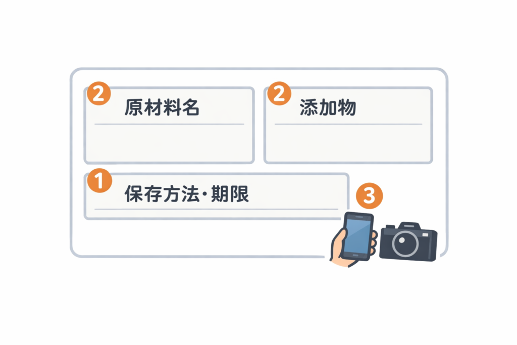 | 添加物が気になる | 原材料名/添加物欄の有無 | 保存方法・期限 | “分からない用語”を見つけたら一旦写真で保存し、その場で深追いしない |
