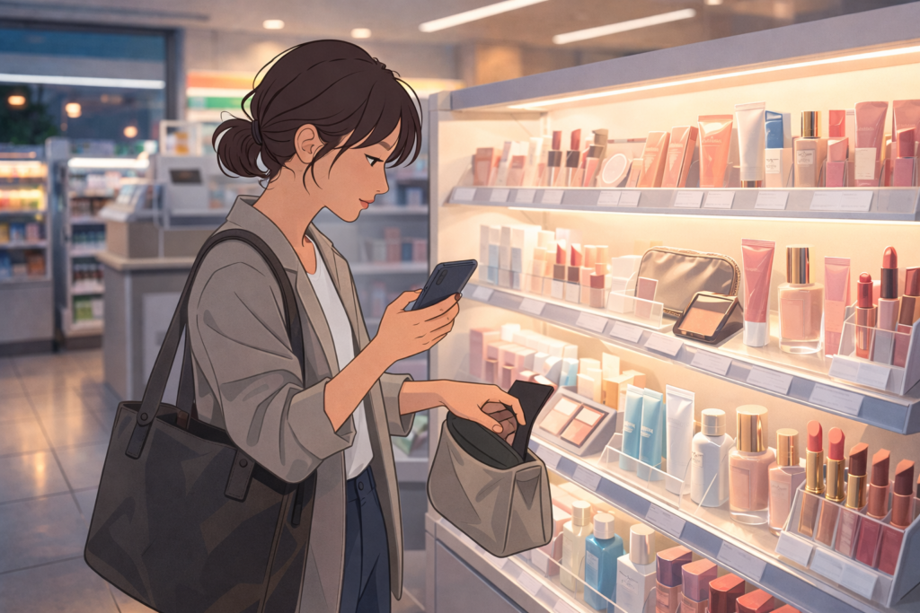 目的別に順番を固定すると、店頭での判断が速くなります。忘れ物なら、肌・眉・口元のうち「一番目立つ崩れ」から入り、次は必要なら補う。夕方の崩れなら、足す前に整える工程を入れてから薄く戻す。これだけで、仕上がりが“慌てて買った感”になりにくくなります。